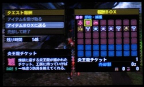 【「炎王龍チケット」の入手先】 ギルドクエスト「テオ・テスカトル」レベル76以上の基本報酬? 【管理人プレイで・・・】 レベル79・テオ・テスカトルの基本報酬・1段目で確認済み